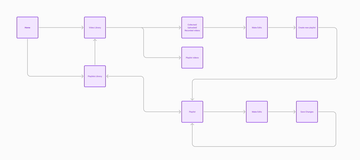 To take it from a 2X to a 10X view, the above walks through at a high level what happens when you start at your account level and then based upon your need make a decision about where you need to go to accomplish that outcome. If you wanted to review all of your videos in your library, which had either been collected through a video request, uploaded or recorded yourself or videos specifically newly created, called playlists, you could from this view. In the video library you could review, download, delete and share. If you wanted to edit however, you needed to either from the beginning experience at the start or once at a list view, or individual detail video view, decide you want to edit, you needed to create a new ‘playlist’ or you could also add to an existing one.
